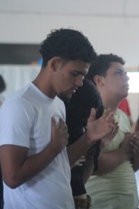 A pregação foi um dos momentos mais impactantes do dia. Com palavras simples e profundas, a pregadora nos levou a refletir sobre o valor da nossa vida e o quanto somos preciosos aos olhos de Deus. Muitos jovens se emocionaram e abriram o coração para acolher o amor do Pai. Verdadeiramente, sentimos que “o Senhor está perto dos que têm o coração ferido, e salva os de espírito abatido” (Salmo 34,18). O Espírito Santo se fez presente ali, renovando a esperança e reacendendo a chama da fé em cada um de nós.