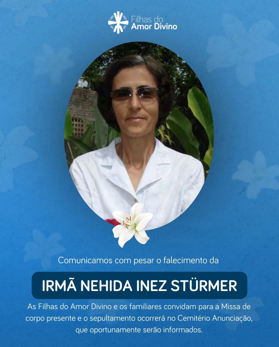 Irmã Nehida morreu após ser atropelada por uma motocicleta na manhã deste domingo (11), no km 6 da BR-050, em Araguari, no Triângulo Mineiro. A vítima foi identificada como Irmã Nehida Inês Stümer, da Congregação Filhas do Amor Divino da cidade de Davinópolis, pertencente a paróquia São José – Distrito de Santo Antônio do Rio Verde, Municipio de Catalão, e natural do Rio Grande do Sul.